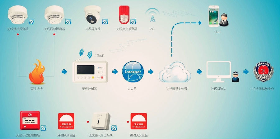 ●可插入手机卡与“智慧消防安全云”进行实时通讯,并将火警、故障等预警信息及时推送到手机App、社区消防站、社区派出所和平安城市控制中心等机构。快速、高效地发现隐患、消灭隐患。